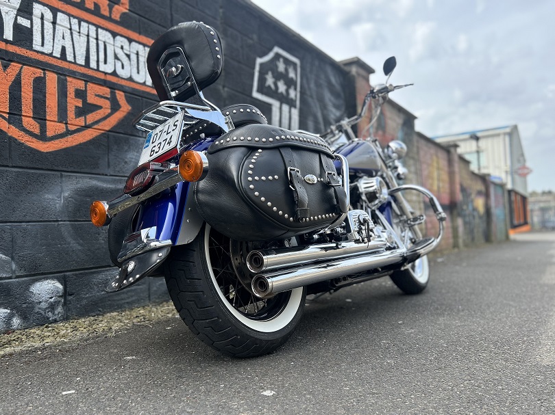 • Classic FLSTC touring setup – full fenders, leather saddlebags, and iconic heritage styling